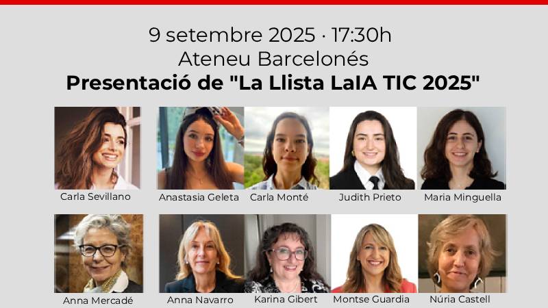 A causa de l’èxit de la convocatòria, la presentació de la Llista LaIA 2025, que tindrà lloc el dimarts 9 de setembre de 2025, es farà finalment a l’Ateneu Barcelonès (Sala Oriol Bohigas, carrer de la Canuda, 6, Barcelona). La sala inicial, a la Cambra de Comerç de Barcelona, s’ha quedat petita davant la gran resposta i interès generat. El canvi d’ubicació garanteix un espai amb la capacitat adequada per acollir totes les persones inscrites, així com ponents i participants, i permetrà cloure la jornada amb un networking al jardí de l’Ateneu, un entorn idoni per fomentar la trobada i la col·laboració entre professionals.