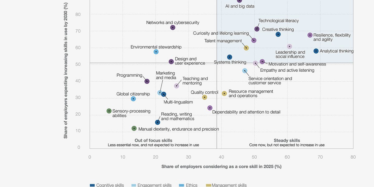 Además, se destaca que las habilidades que más crecerán en los próximos años incluyen la inteligencia artificial y el big data, el pensamiento creativo, la alfabetización tecnológica, la resiliencia, la curiosidad y el aprendizaje continuo. En contraposición, habilidades como la lectura y escritura básica están en declive. Este informe se basa en una encuesta realizada a más de 1,000 grandes empresas de todo el mundo, abarcando más de 14 millones de trabajadores en 22 sectores y 55 economías, lo que proporciona una visión representativa, aunque con un sesgo hacia las grandes corporaciones.